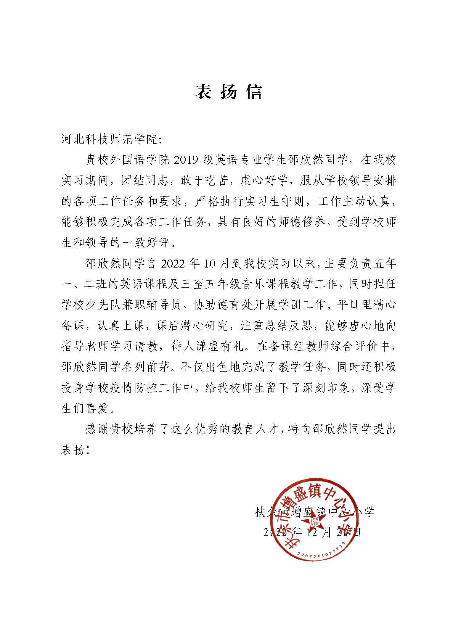 近日,吉林省扶余市增盛镇中心小学向kaiyun官网发来表扬信,感谢kaiyun官网英语专业邵欣然同学在该校出色地完成顶岗实习任务。