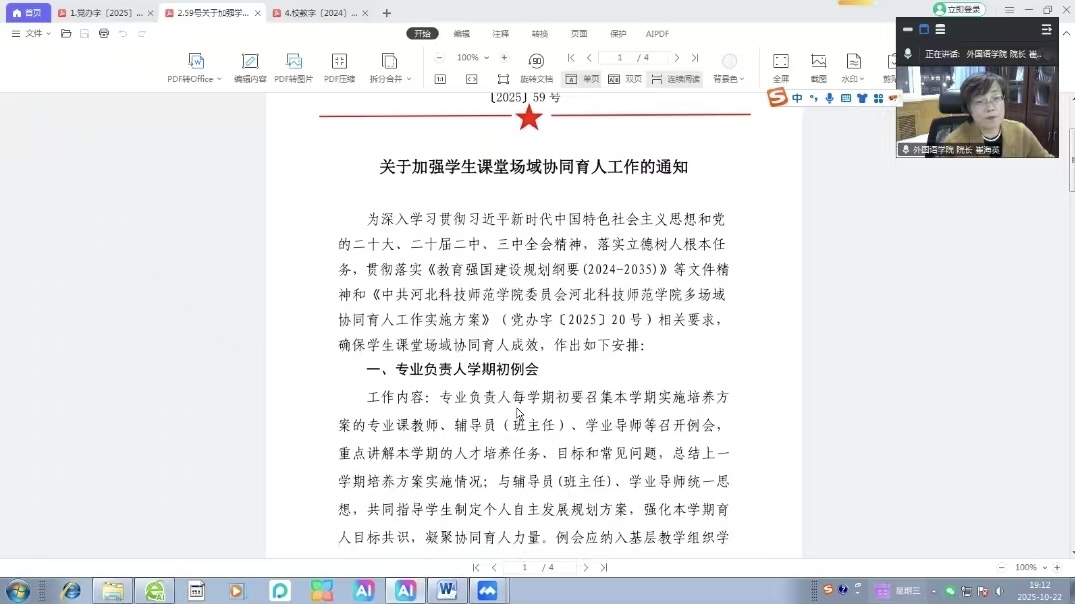 2025年10月22日晚,kaiyun中国官方网站组织召开线上专题工作会议,重点学习《多场域协同育人工作实施方案》(〔党办字 25〕 20号)、《关于加强学生课堂场域协同育人工作的通知》(〔2025〕59 号)、《本科生学业导师管理办法 》(校教字〔2024〕 25号)等文件。会议由崔海英院长主持,学院领导班子成员、教学部主任及专业负责人参加。