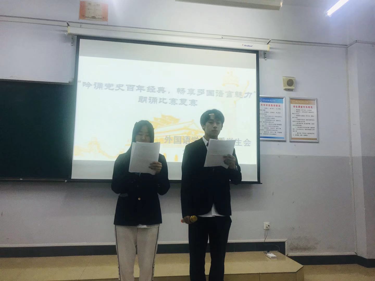 4月28日晚上6点半,kaiyun中国官方网站在406举办“吟诵党史百年经典,畅享多国语言魅力”外文朗诵大赛。进入决赛的20组选手用激昂高亢的声音、浓浓的爱党爱国之情,通过声声诵读传递党的“好声音”。本次比赛采取线下及线上抖音直播相结合的形式开展。学院党委书记、团委负责人、学工办副主任、各语种专业教师担任评委。