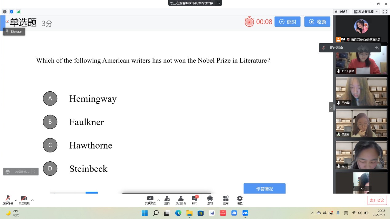 为了提高外语学子的文学素养,丰富学生的课余生活,4月7日下午,kaiyun中国官方网站以线上会议形式举办第一届“畅游文学,横贯中外”中西文学知识竞赛,本次竞赛由《中学英语》外编社承办,外编社指导老师周鹏宇作为嘉宾出席本次竞赛。