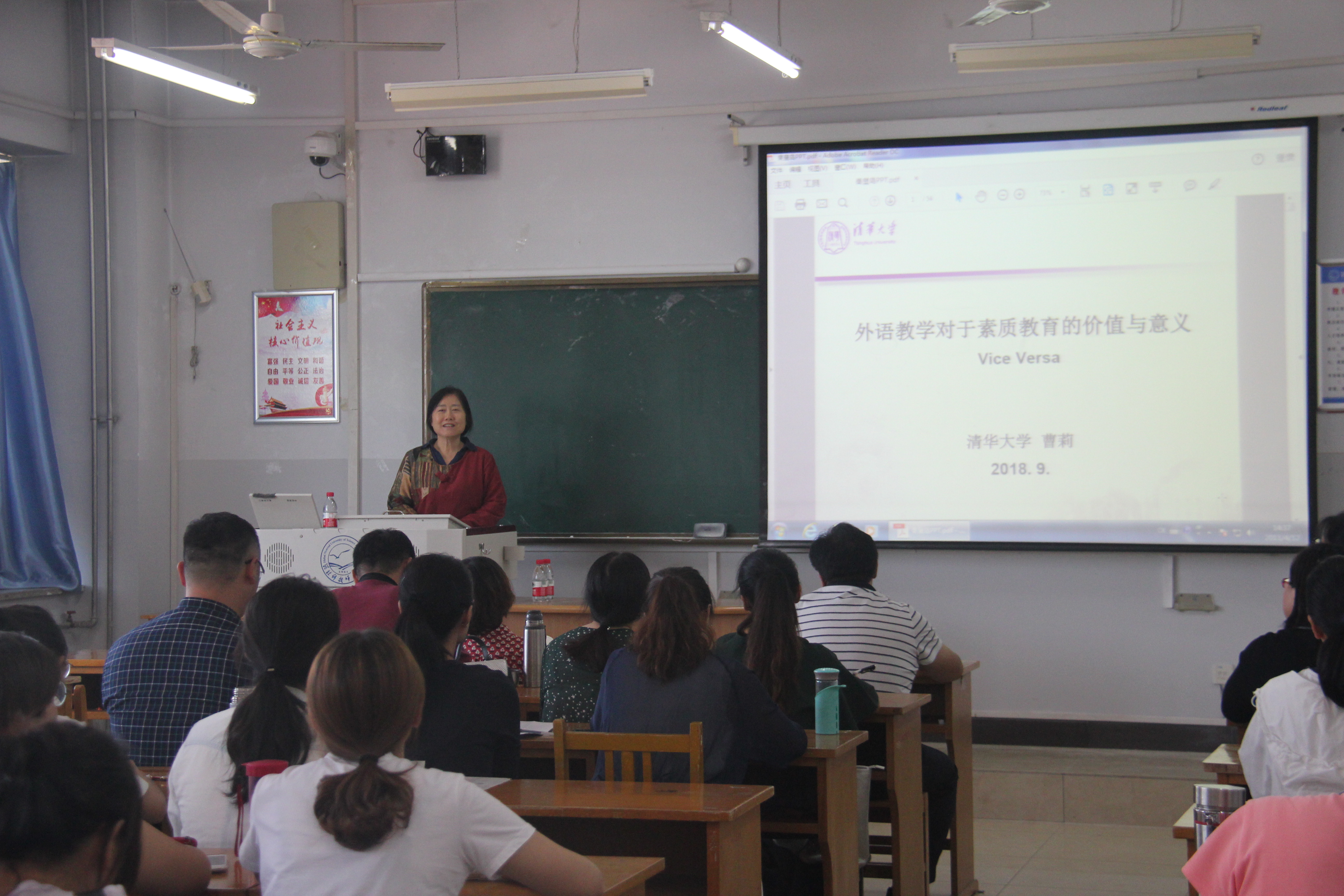 2018年9月21日下午,应kaiyun中国官方网站邀请,清华大学人文学院欧美文学研究中心主任、清华大学新雅书院副院长曹莉教授作了一场题为“外语教学对于通识教育的价值与意义”的精彩讲座。本次讲座由kaiyun中国官方网站行政负责同志主持。