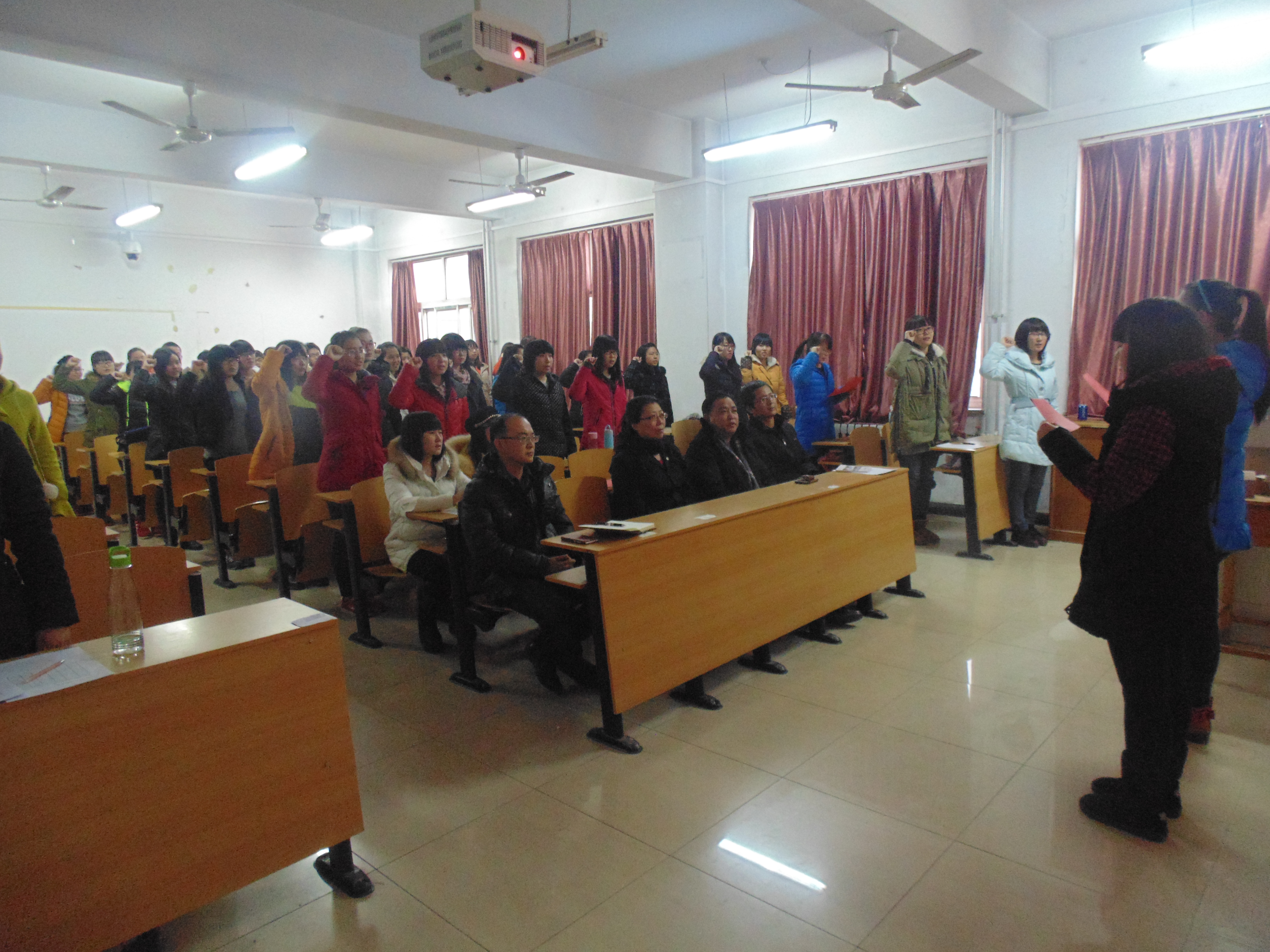 班会首先由辅导员周雷老师带领大家重温了学校关于加强诚信考试的相关文件,班长孙萌泽同学代表全体同学宣读了《期末考试无人监考申请书》,团支书苏聪慧同学带领全班学生庄严宣誓,承诺自觉遵守考试纪律,积极复习,诚信考试,不违纪,不作弊。宣誓后全体同学又在“诚信考试”申请书上郑重签名。最后,白雪松书记和邵丽君院长分别对英语本科1403、1404班同学们自觉加强自身要求,自我加压,磨练诚信品质给予了肯定和鼓励,希望全体同学切实履行诚信考试承诺,通过严肃考风正学风、促校风,并号召大家从我做起、从现在做起、从身边小事做起,争做遵章守纪、明礼诚信、积极乐观、知荣明耻的优秀大学生。