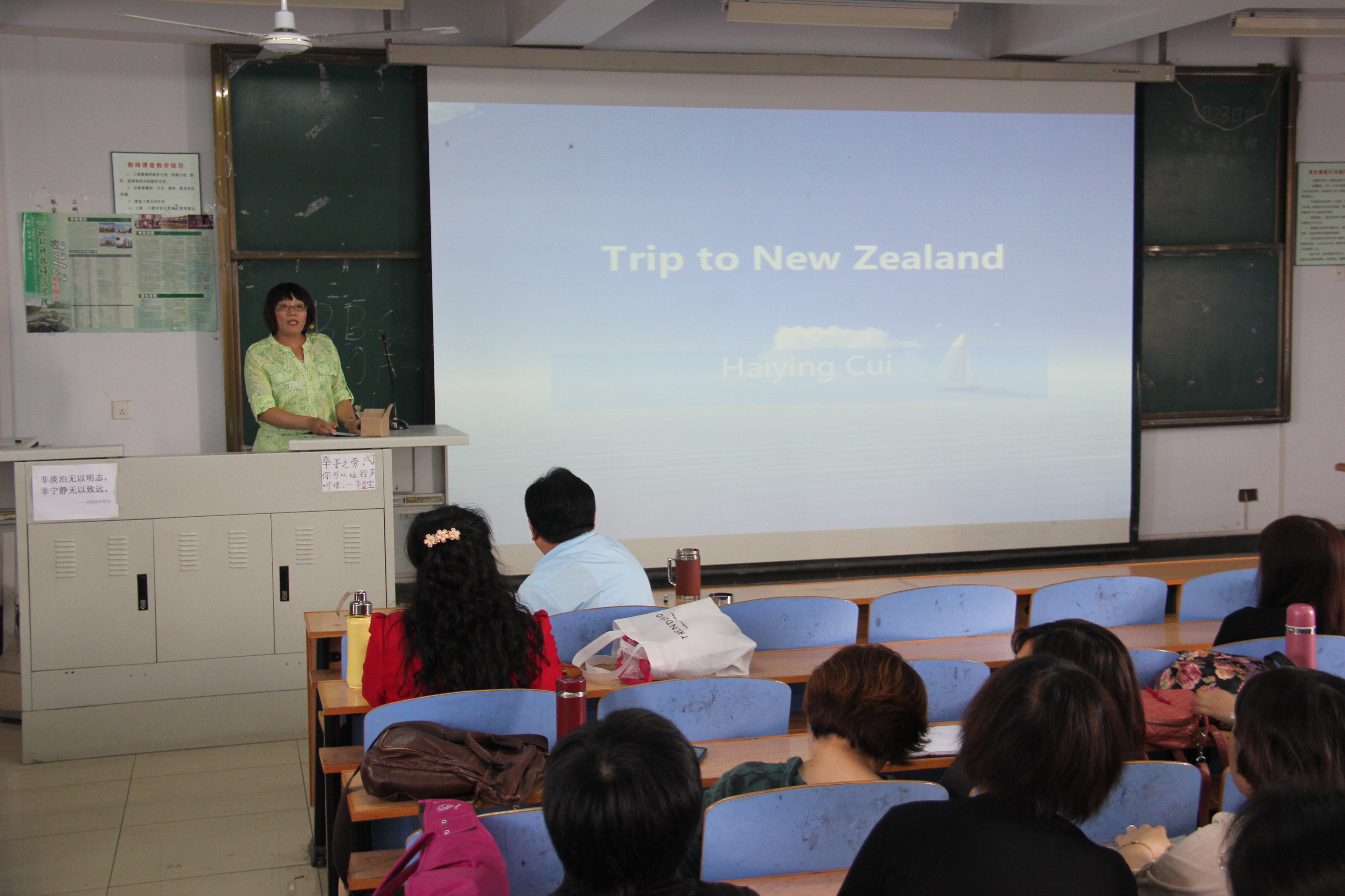 会议由邵丽君院长主持,两位海外归国教师崔海英、张喜荣分别做了总结汇报。崔海英副院长主要从语言学习和语言应用方面介绍了新西兰之行的收获。在新西兰学习的三个月里,崔院长细心的总结了新西兰英语中的发音规律与不同,在住家生活中体会到了英语语言的魅力。张喜荣老师着重从课程学习和跨文化体验方面介绍了自己的收获。