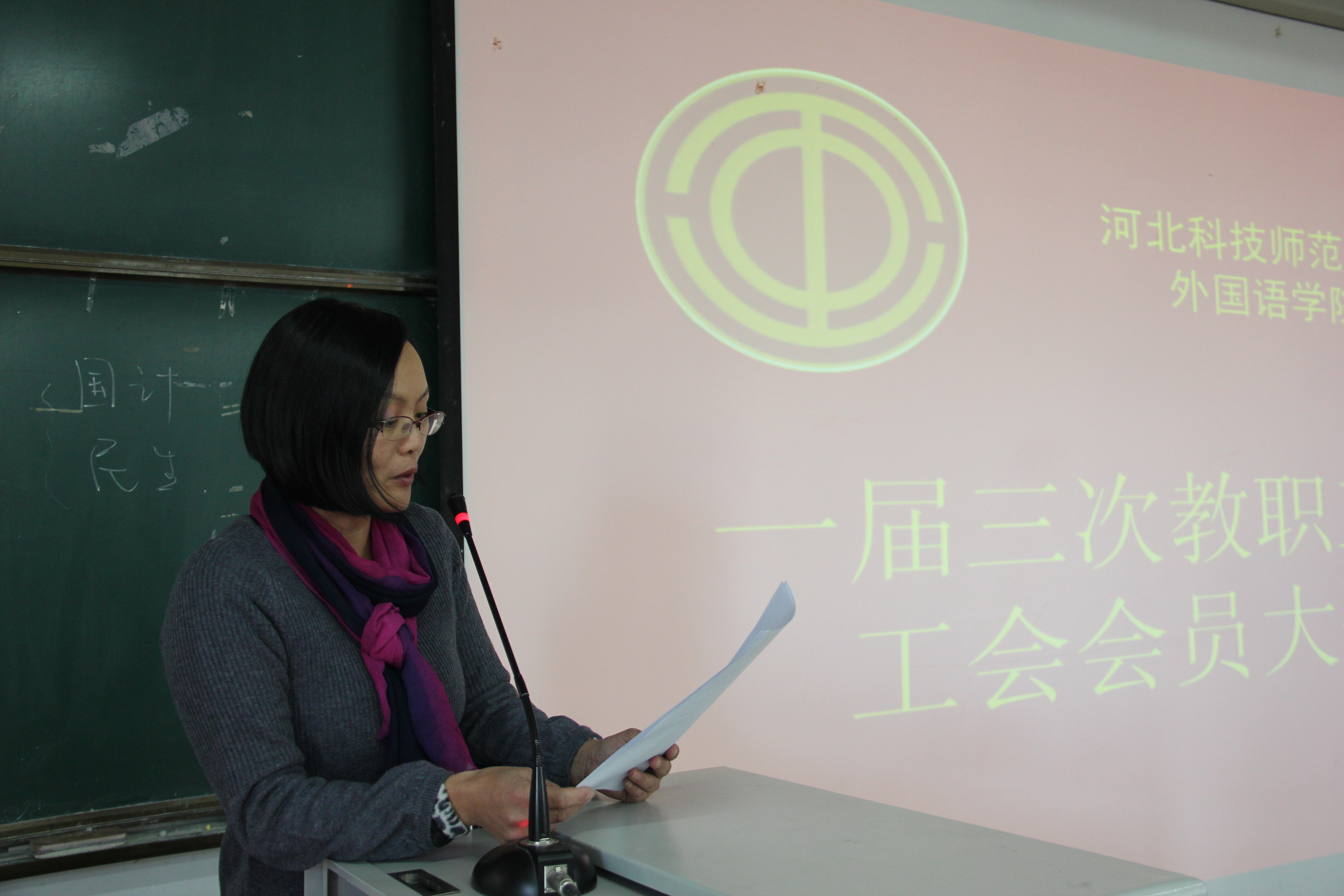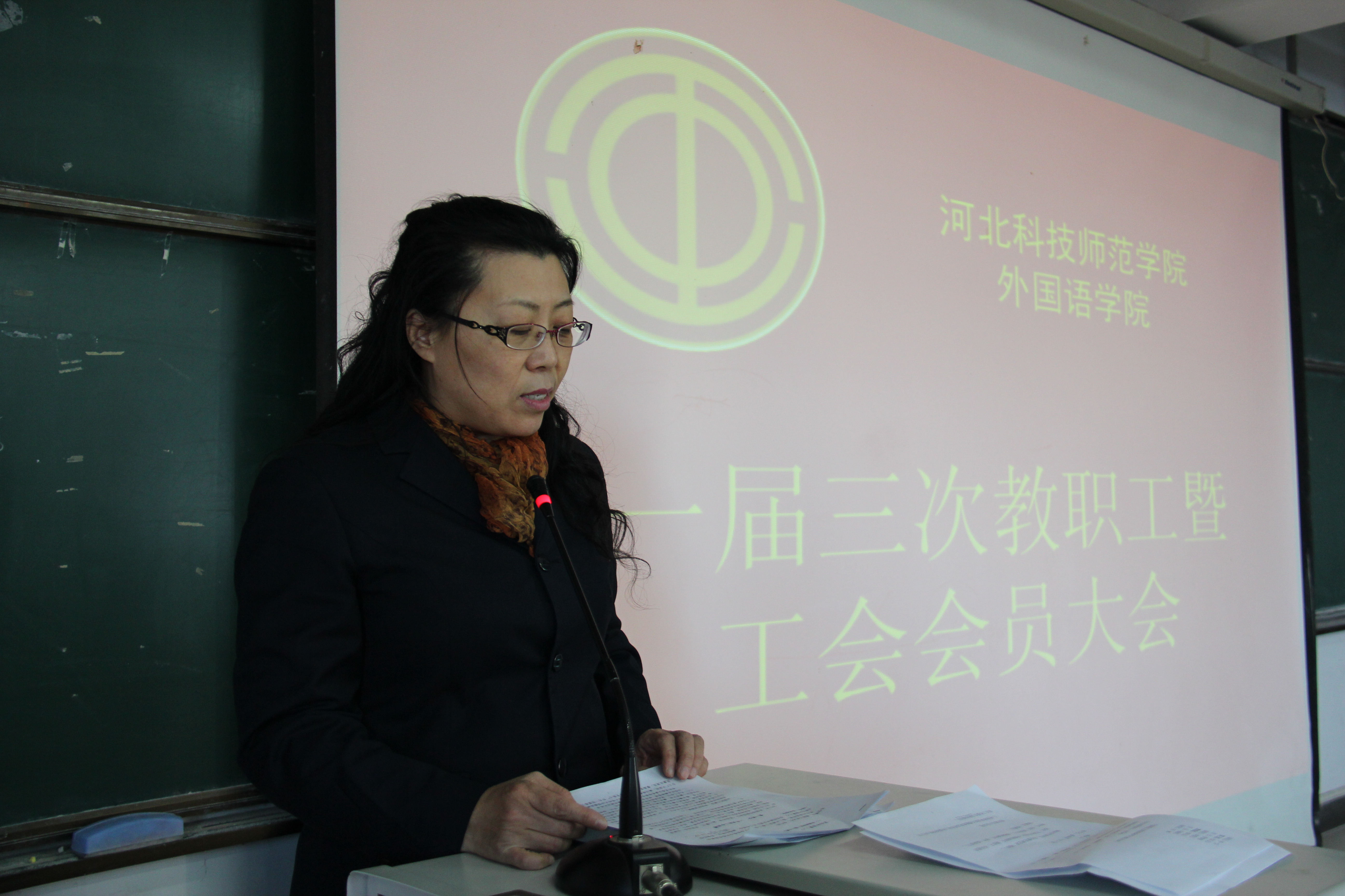 图为学院工会副主席马晓迎作报告