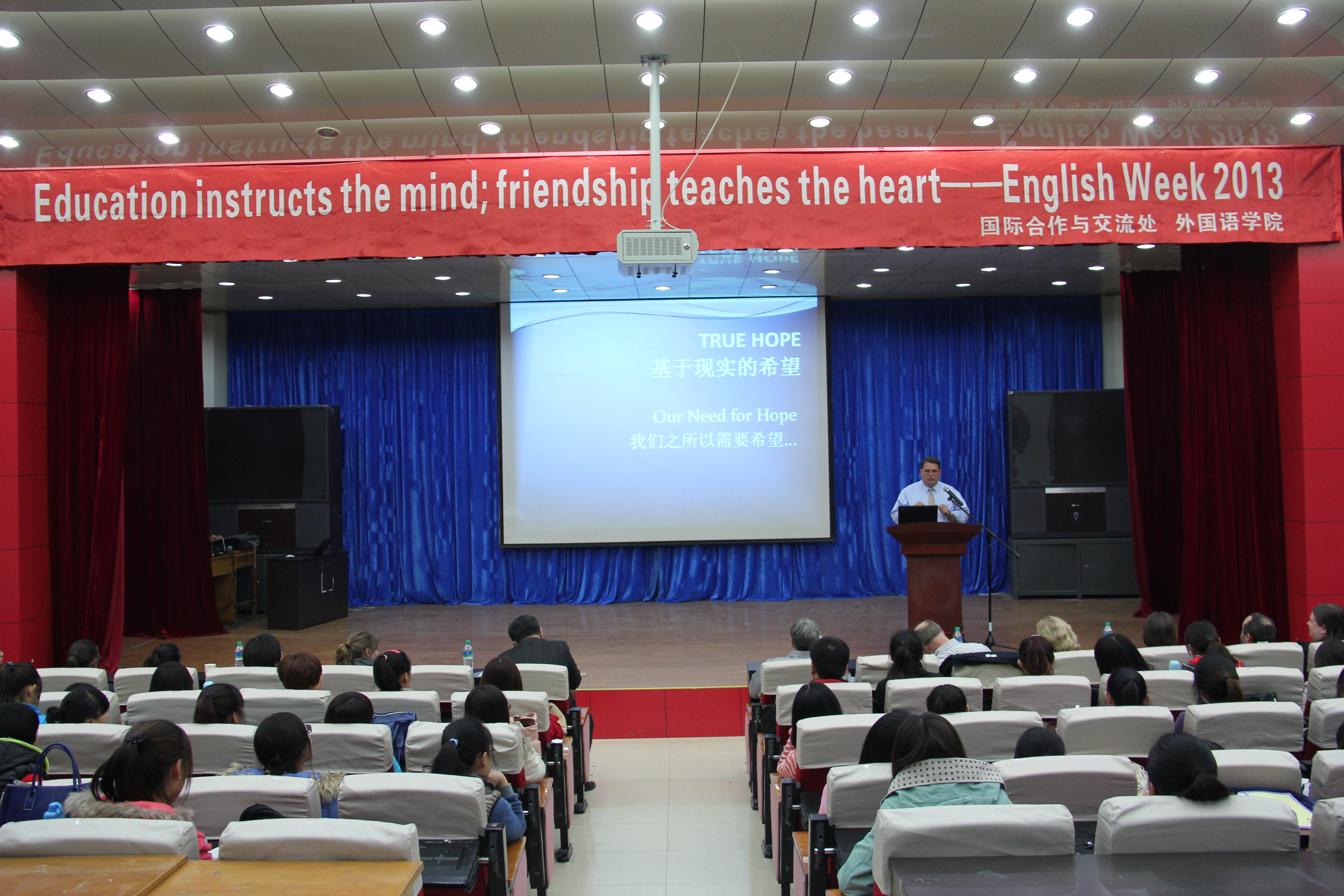 2013年10月25日晚,由kaiyun官网国际合作与交流处主办,kaiyun中国官方网站承办的“启梦科师2013”系列活动之英语周在开发区校区学术报告厅闭幕。国际合作与交流处、kaiyun中国官方网站相关领导及师生400余人参加了闭幕式。