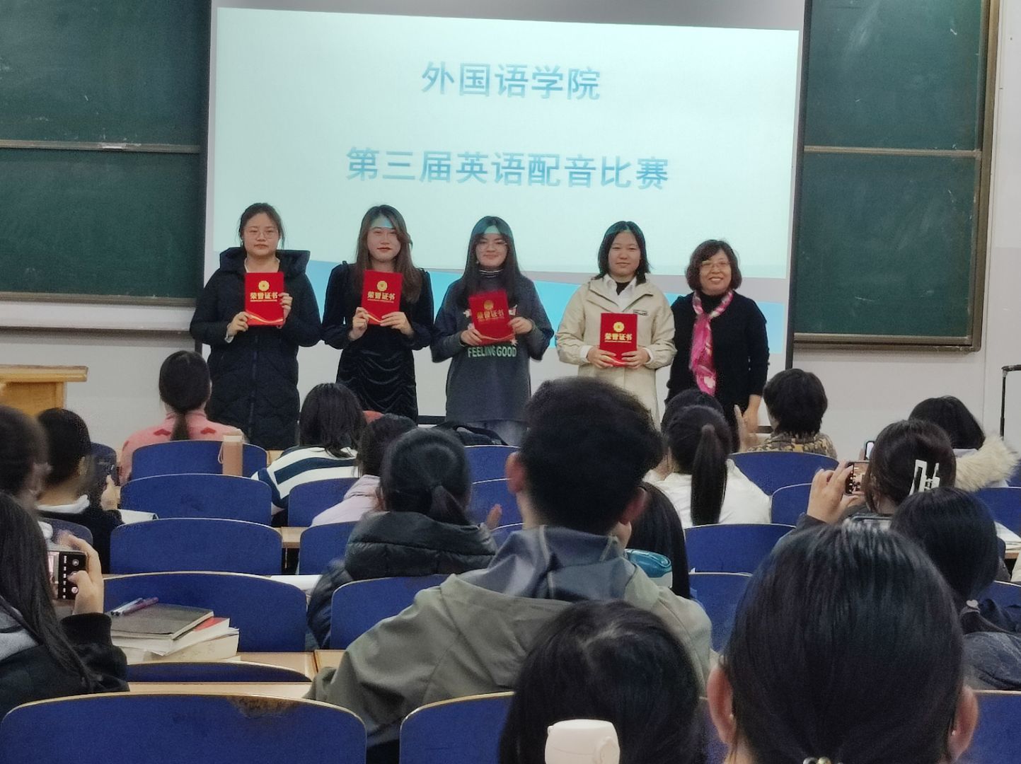 比赛开始前,学生会工作人员布置场地,进行多媒体设备的调试,并引导各位评委老师、比赛选手和观众有序入场。比赛开始后,主持人宣布比赛规则及流程,参赛选手有序上台进行比赛,配音展示后由评委老师对小组表现进行打分,工作人员核算得分。经过近两个小时的角逐,最终产生一等奖两组、二等奖四组、三等奖六组:《爱丽丝梦游仙境》组、《疯狂动物城》组荣获一等奖;《寻梦环游记》《功夫熊猫》等组荣获二等奖;《疯狂动物城》《飞屋环游记》《灰姑娘》等组荣获三等奖。赛后评委为获奖小组颁发荣誉证书。崔海英院长对同学们精彩的表现表示由衷地赞赏,并从规范发音、投入演绎、团队合作等方面对大家的表现给出中肯地点评,学生们收获颇丰。