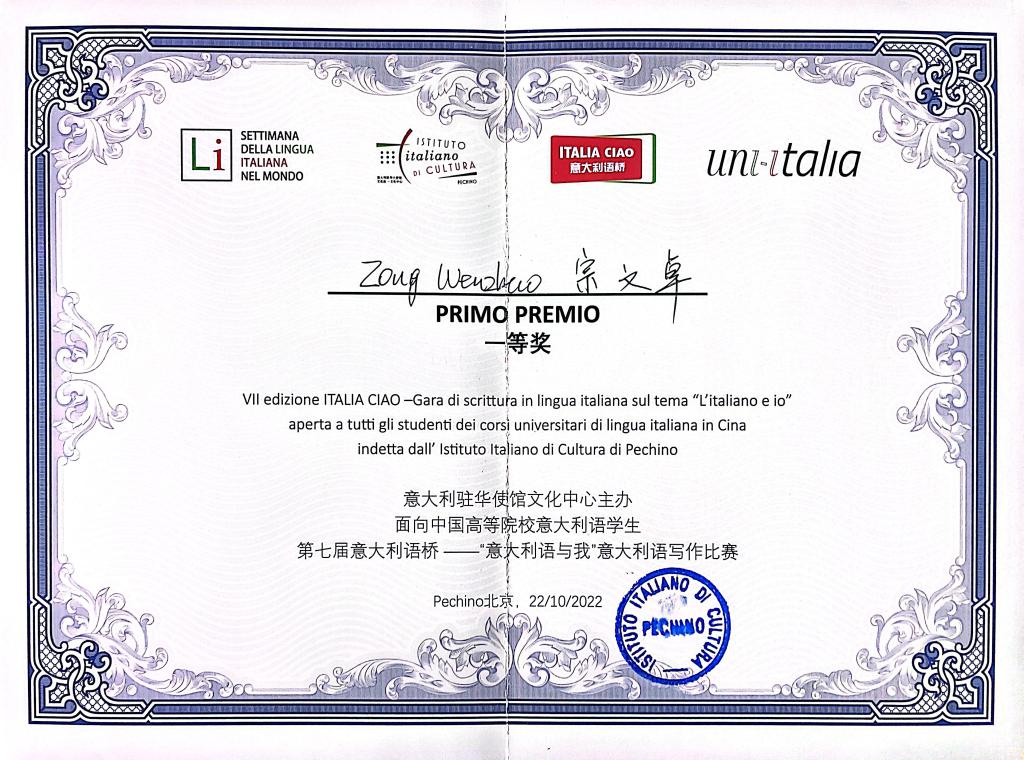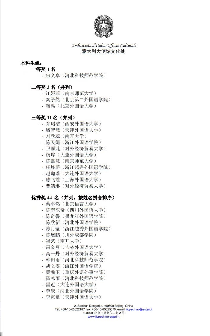全国“ITALIA CIAO/意大利语桥”大赛由意大利驻华使馆文化处主办,每年以不同的主题、不同的形式进行,是专门面向全国高等院校意大利语专业学生进行的意大利语竞赛,也是全国意大利语专业学子们最重要的学习和交流的平台。本次比赛获奖彰显了kaiyun官网意大利语专业的办学实力和教学质量,为kaiyun官网赢得了良好的社会声誉。