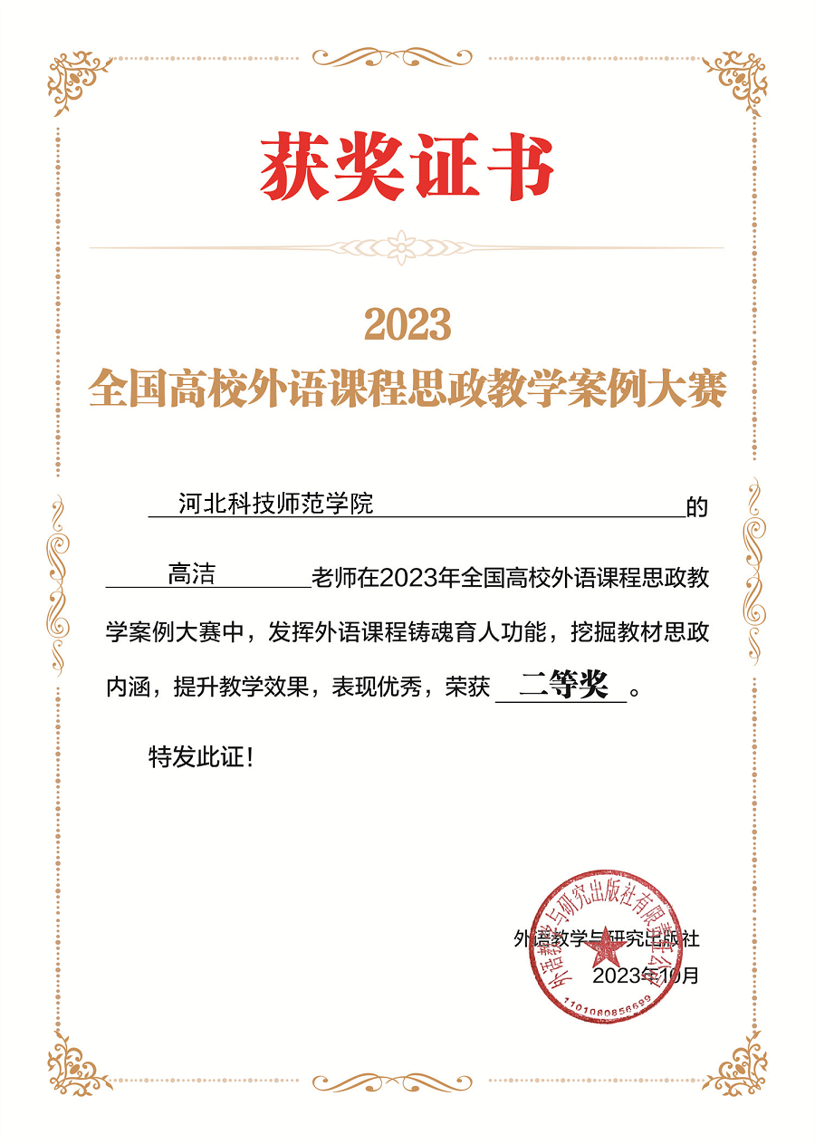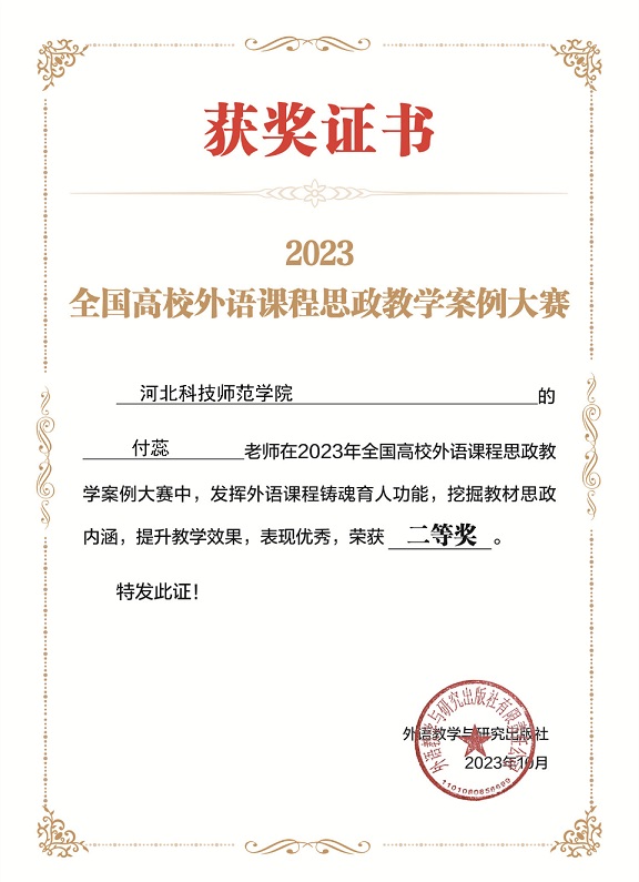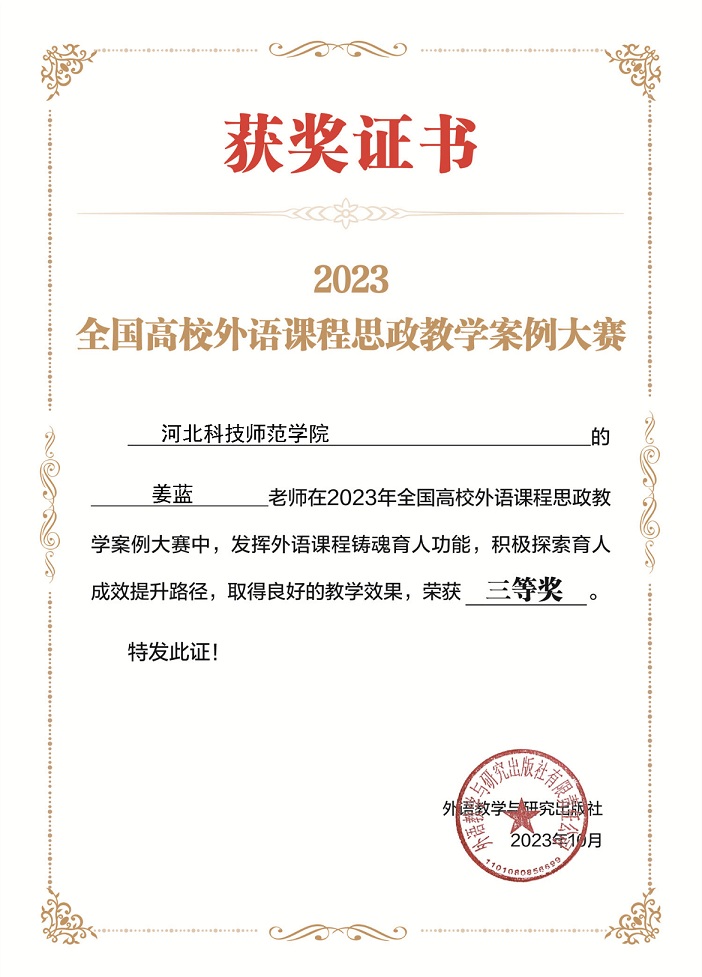 近日,2023年全国高校外语课程思政教学案例大赛落下帷幕,全国2000余名教师参赛,经过资格审查和通讯评审,kaiyun官网4名教师脱颖而出,白丽伟、付蕊、高洁老师荣获二等奖,姜蓝老师荣获三等奖,同时获得数额不等的教师研修基金。