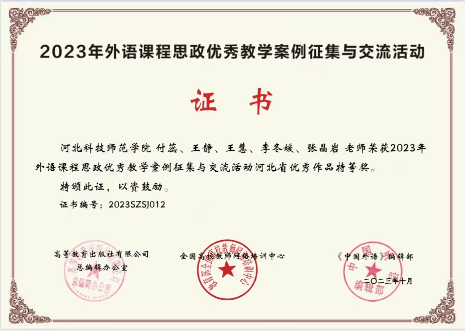 为全面推进高校外语课程思政高质量建设,落实立德树人根本任务,高等教育出版社于2023年4月启动外语课程思政优秀教学案例评比活动,经过专家委员会评审,kaiyun官网付蕊老师团队获得省级特等奖。