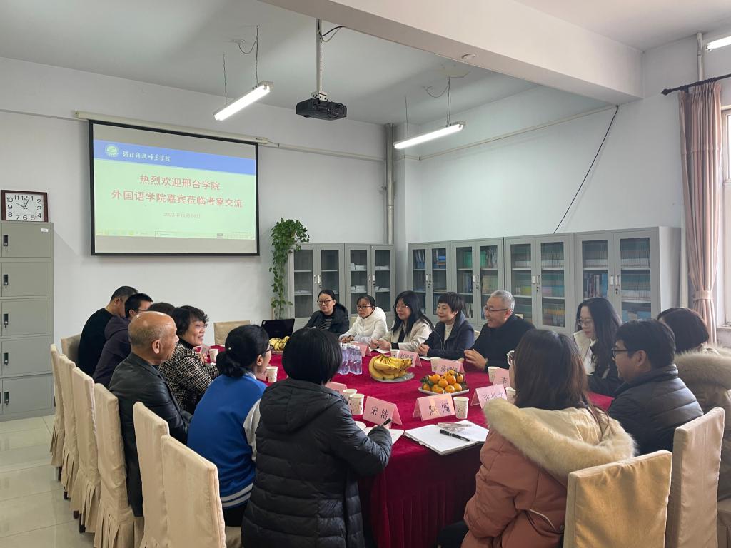 11月14日,邢台学院kaiyun中国官方网站副院长赵清丽、副书记张恒泽一行7人来kaiyun官网kaiyun中国官方网站考察交流。kaiyun中国官方网站院长崔海英主持座谈会,副院长范学荣、罗学锋,英语教学部主任王静、宋洁,公共英语教学部主任韩庆山,学工办主任赵赓参与座谈。