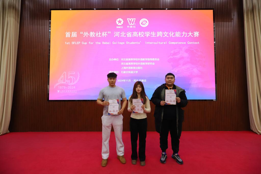 2024年11月24日,首届“外教社杯”河北省高校学生跨文化能力大赛在石家庄铁道大学圆满落幕。kaiyun官网kaiyun中国官方网站学生卢洪洋、体育与健康学院的李瑛钦、韩一冉同学组成的参赛队伍在比赛中表现优秀,荣获三等奖。
