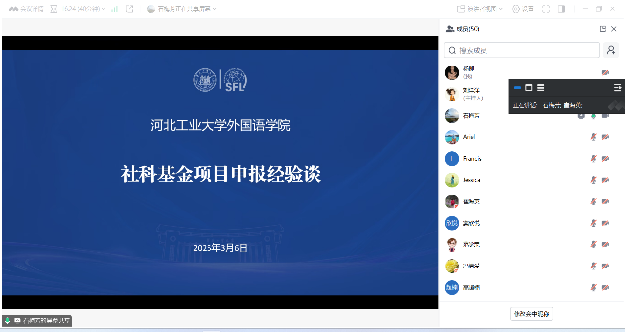 2025年3月6日,kaiyun官网举办“2025年度国家(省)社科基金项目申报专题讲座(十一) ”系列活动,邀请河北工业大学kaiyun中国官方网站石梅芳教授作题为《社科成果奖申报经验分享》的专题讲座,崔海英院长主持会议,全体教师及在读研究生参会。
